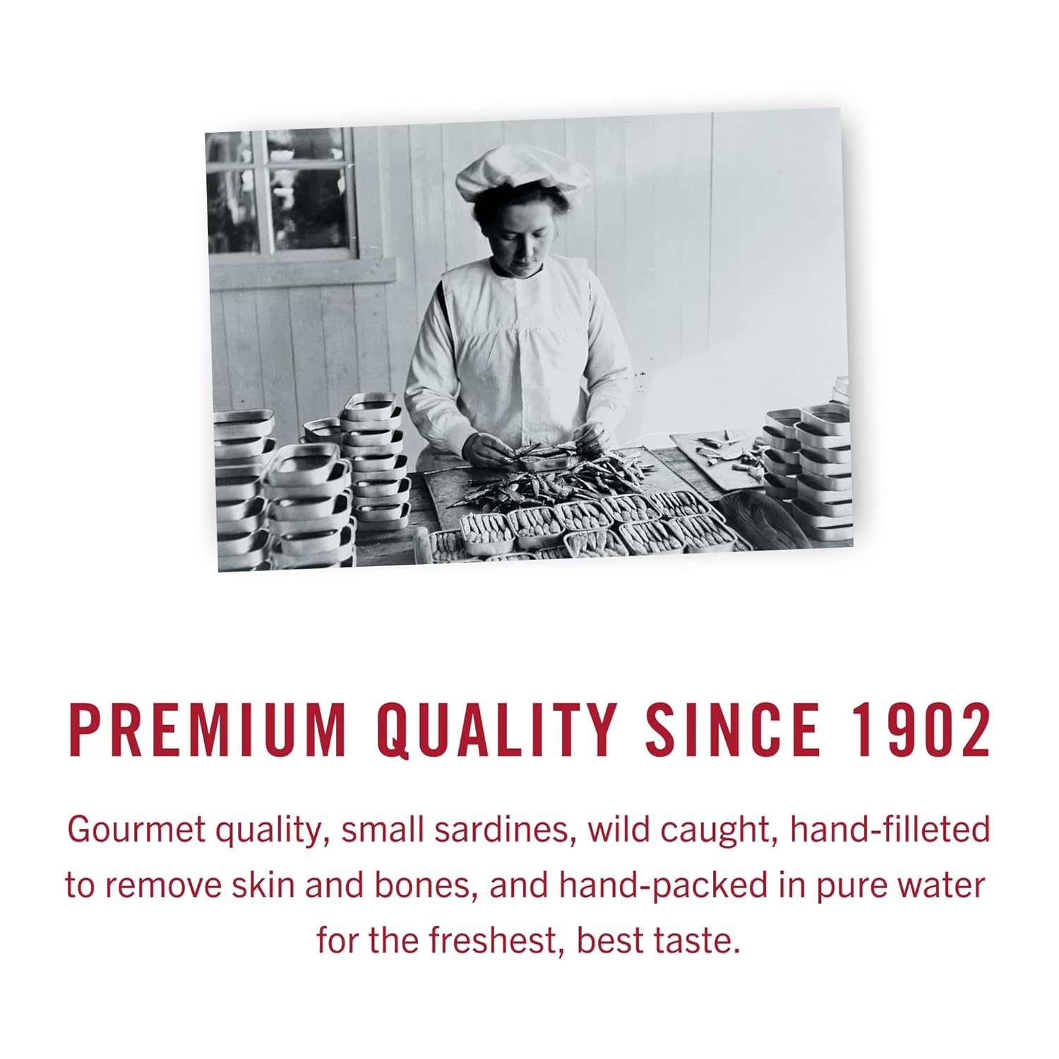 PREMIUM QUALITY SINCE 1902: These premium pilchard sardines are harvested in the Atlantic Ocean. The skin and bones are removed for a mild taste and rich texture similar to albacore tuna. Every can is hand-packed to ensure premium quality.