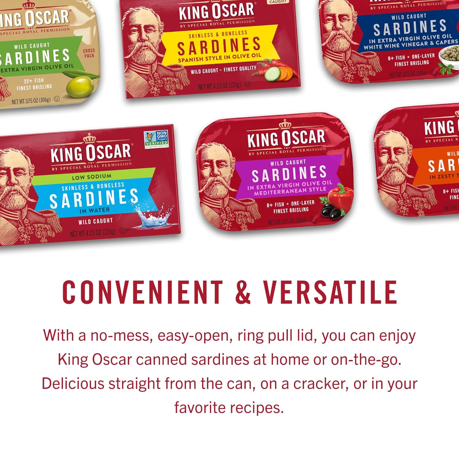King Oscar Sardines in Water, 4.23 Ounce Cans (Pack of 1( Packaging May Vary), Skinless & Boneless, Wild Caught Canned Sardines, Low Sodium
