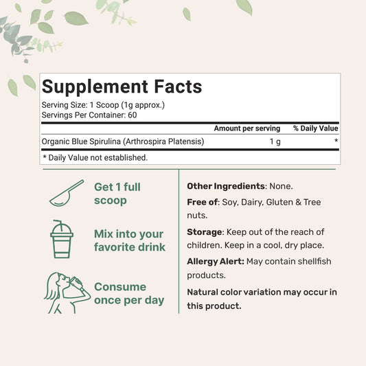 Micro Ingredients Organic Blue Spirulina Powder (Phycocyanin Extract), 60 Servings - No Fishy Smell, 100% Vegan Protein from Blue-Green Algae