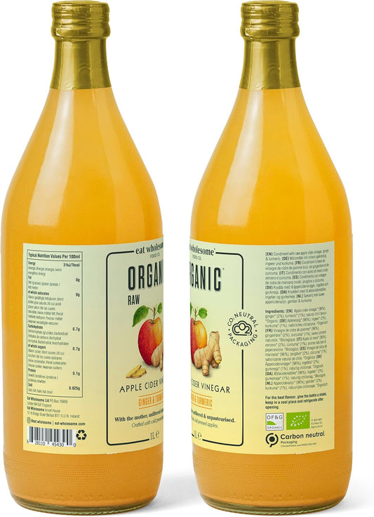 Eat Wholesome Organic Ginger, Turmeric and Chilli Raw Apple Fire Cider Vinegar with The Mother, Glass Bottle in Box, 1L