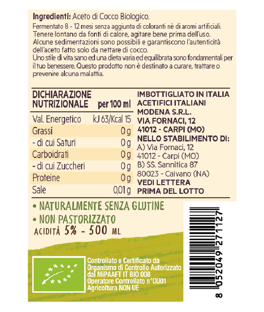 De Nigris Organic COCONUT Vinegar Raw & Unfiltered 16,9 Oz (500ml) | Balsamic Vinegar Coconut With Mother For The Balance Of Metabolism | Organic Pomegranate Balsamic