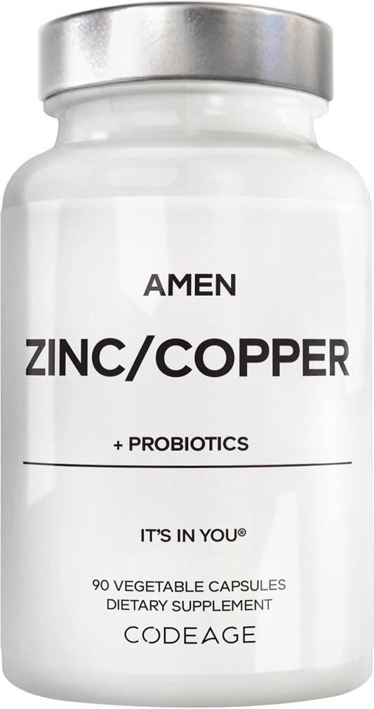 Amen Zinc & Copper Supplement + Probiotics, 3 Months Supply, One Per Day - 50 mg Zinc Picolinate Vitamin Pills - Essential Minerals Supplements – 2 Billion CFUs Probiotic – Vegan, Non-GMO, 90 Capsules
