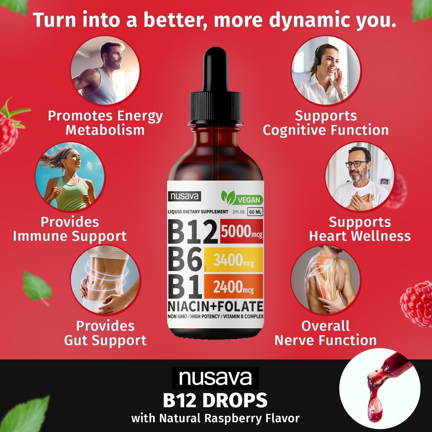 - B12 Drops Formulated for Maximum Potency - Our Liquid Vitamin B12 Drops contain Vit B12 5000mcg, B6, B1, Niacin, and Folic Acid, supporting overall body functions with 100% or more Daily Value.