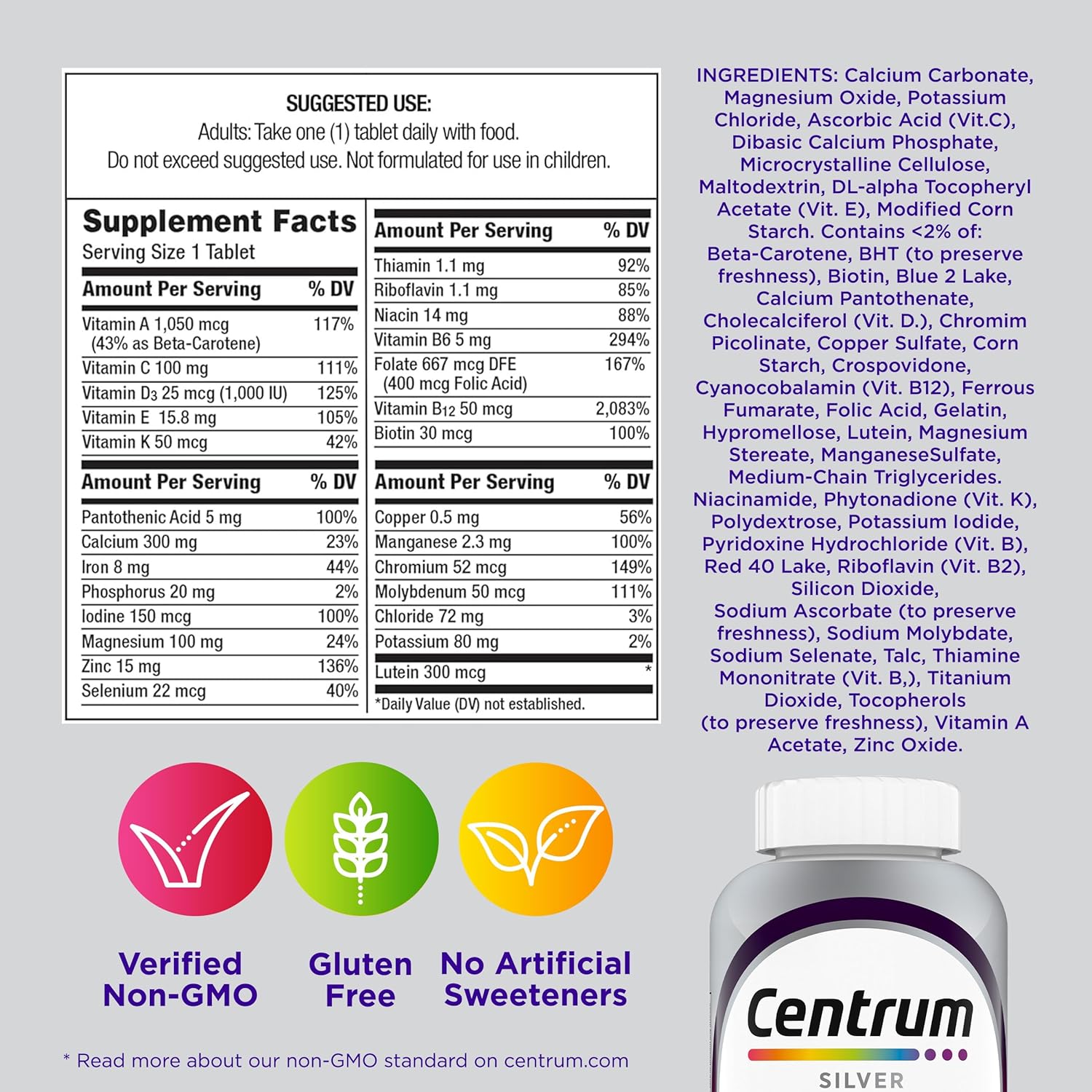 Centrum Silver Women's Multivitamin for Women 50 Plus brings you a tailored multivitamin/multimineral supplement that contains micronutrients to help support full body wellness (1). This women's vitamin with iron contains essential nutrients, including vitamin D and calcium to support strong bones and B Vitamins to help promote heart health (1, 2). This multivitamin for women over 50 also contains zinc and B Vitamins to help support normal brain function and Vitamins A, C, and E for eye health (1, 2). Key micronutrients in these multivitamins with zinc supplements help fill in nutritional gaps to promote overall wellness and vitality (1). These women's vitamins are verified Non-GMO (3) and gluten free. This women's multivitamin with iron features a smooth coating that makes it easy to swallow. Simply take one multivitamin daily to provide your body with essential vitamins and minerals. Centrum Silver is the number 1 Doctor recommended multivitamin brand now shown to support memory and cognition in older adults (1).* * IQVIA: Claim substantiation Validation Statement. July 2023. IQVIA, using the ProVoice Survey, recorded the product recommended most often within the Adult Multivitamins category by physicians and pharmacists in the United States. A statistically significant majority of the panel of physicians and pharmacists responded that Centrum is the product they endorse most.(1) These statements have not been evaluated by the Food and Drug Administration. This product is not intended to diagnose, treat, cure or prevent any disease.(2) Not a replacement for cholesterol-lowering drugs (1) (3) Read more about our Non-GMO standard on Centrum's official website.