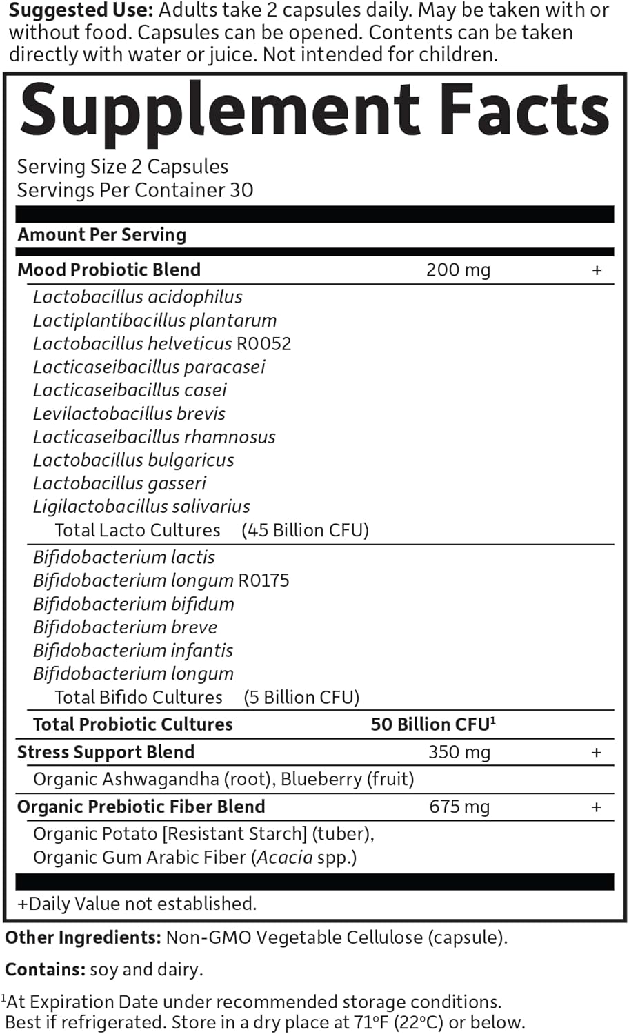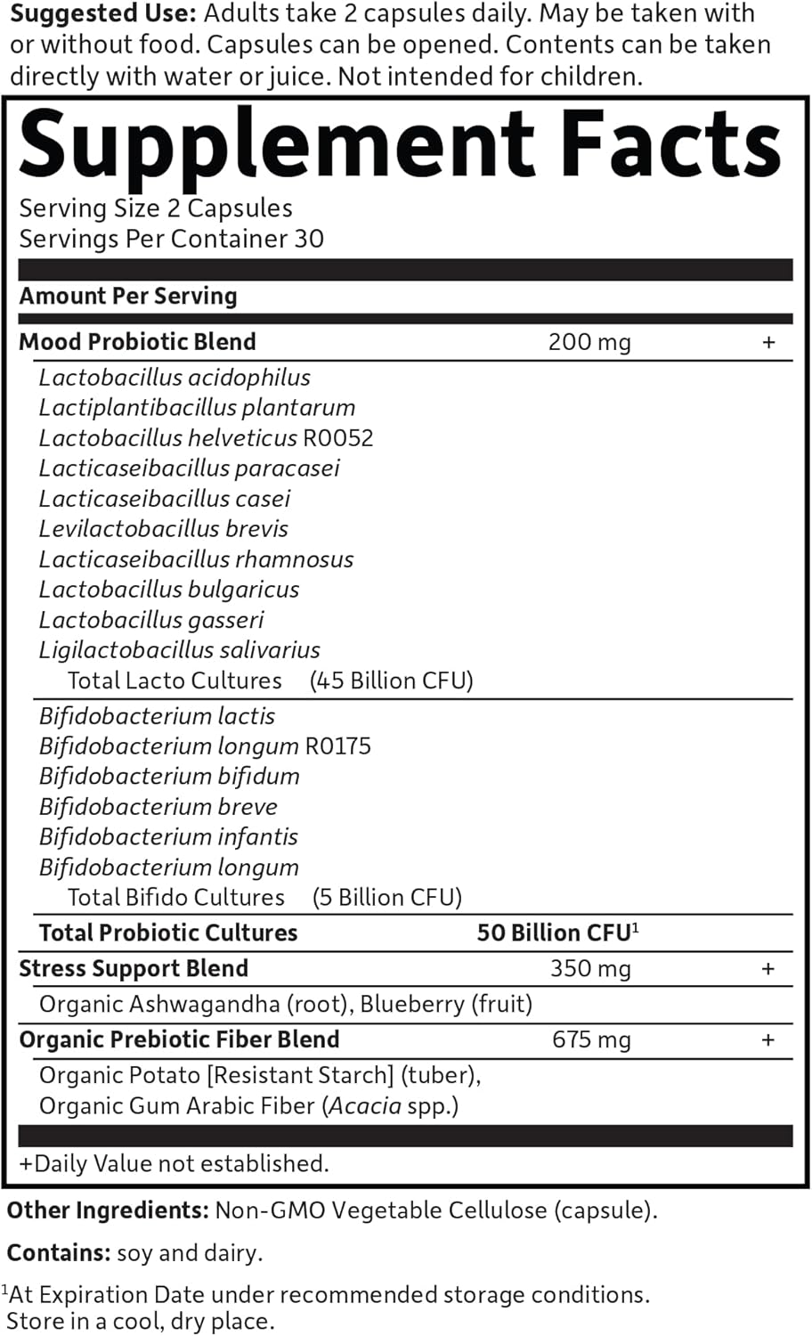 Dr. Formulated Probiotics Mood is a unique probiotic formula with clinically studied strains to support mood and includes organic ashwagandha and organic Alaskan blueberries—all in just 2 capsules a day †. Emerging science is showing a link between gut and brain health. Dr. Perlmutter created this unique formula with 16 probiotic strains including clinically studied probiotics L. helveticus R0052 and B. longum R0175 in the amounts clinically shown to support mood and relaxation.† Mood plus probiotics for women and men also have 350mg of organic ashwagandha and organic Alaskan blueberries. Shelf stable, no need to refrigerate.