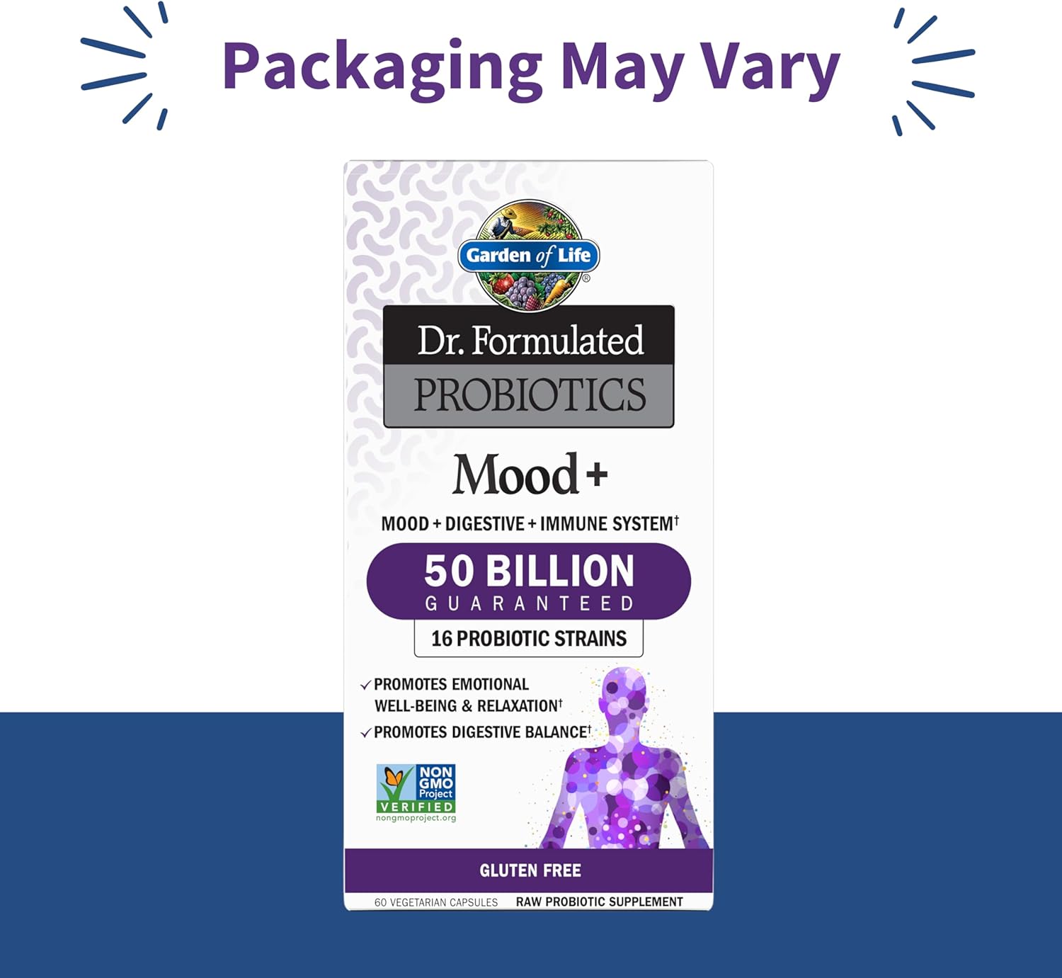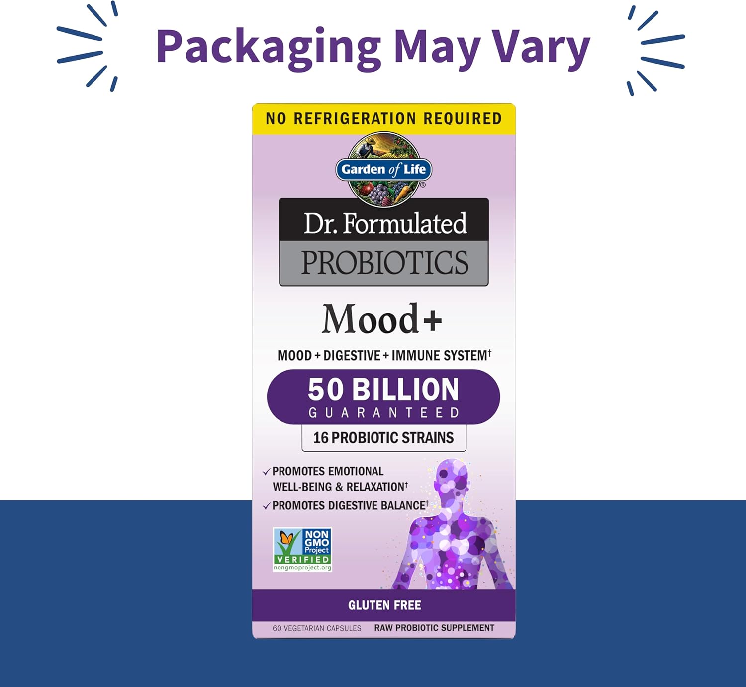 Garden of Life Probiotics Mood+ Dr Formulated Acidophilus Probiotic Supplement - Promotes Emotional Well-Being, Relaxation and Digestive Balance - Ashwagandha for Stress Management, 60 Veggie Caps
