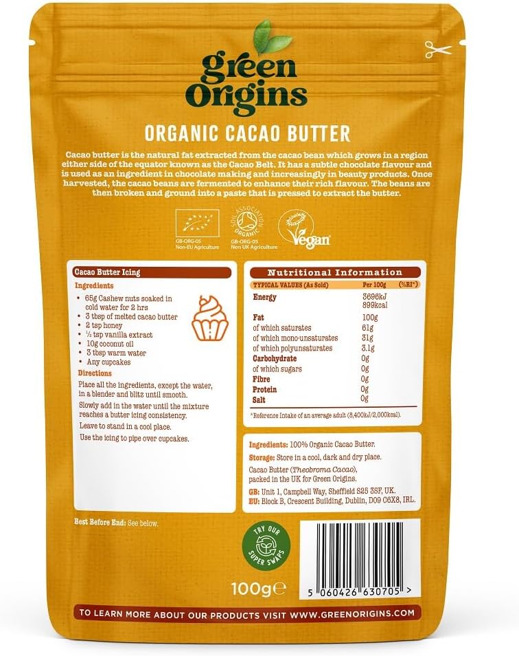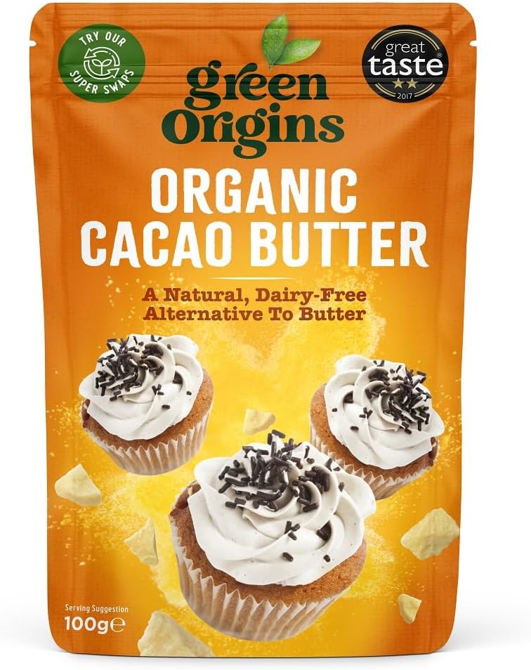 Cacao butter is the natural fat extracted from the cacao bean. It has a subtle chocolate flavour and is used as an ingredient in chocolate making and increasingly in beauty products. Grown in South America, the cacao beans are fermented to enhance their rich flavour. The beans are then broken and ground into a paste that is pressed to extract the butter.Great Taste 2017 Award Winner - with two-star accreditation - The judges commented: "A very versatile culinary product."Produced in South America, packed in the UK. Certified Organic by the UK Soil Association and registered by the Vegan Society.