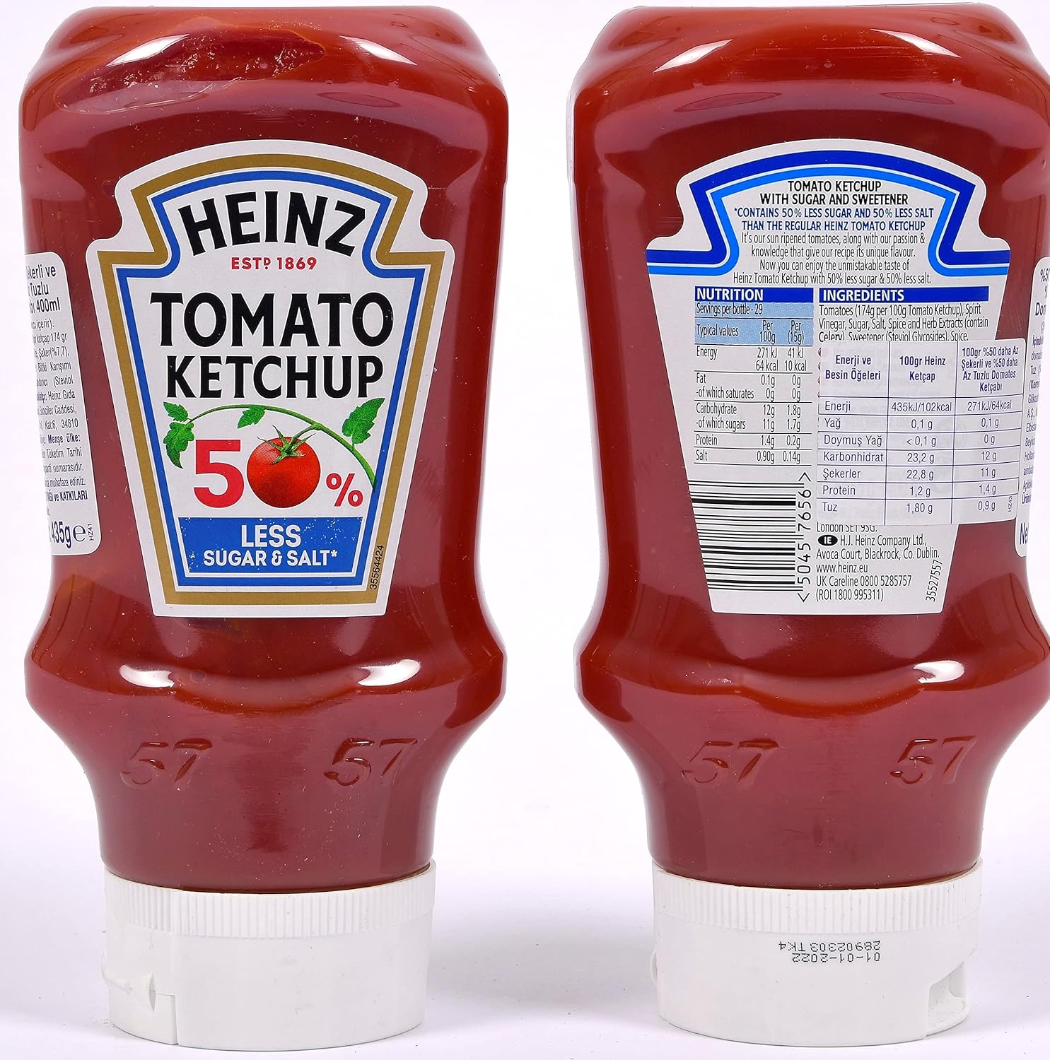 50% less sugar & salt* *contains 50% less sugar and 50% less salt than the regular Heinz Tomato Ketchup Our Heinz Tomato Ketchup has been a staple at mealtimes since 1886. It's the unmistakable taste of our sun-ripened tomatoes, along with our passion and knowledge that gives our recipe its unique flavour - the irresistible rich thick taste of Heinz you know and love. Grown not made, our tomato ketchup goes perfectly with just about anything. Now enjoy the irresistible taste of Heinz Tomato Ketchup with 50% Less Sugar & 50% Less Salt - a healthier alternative for those looking to reduce sugar & salt from the foods they eat. Sweetened from a natural source, and with absolutely no artificial colours, flavours, preservatives or thickeners, no other ketchup tastes quite like it