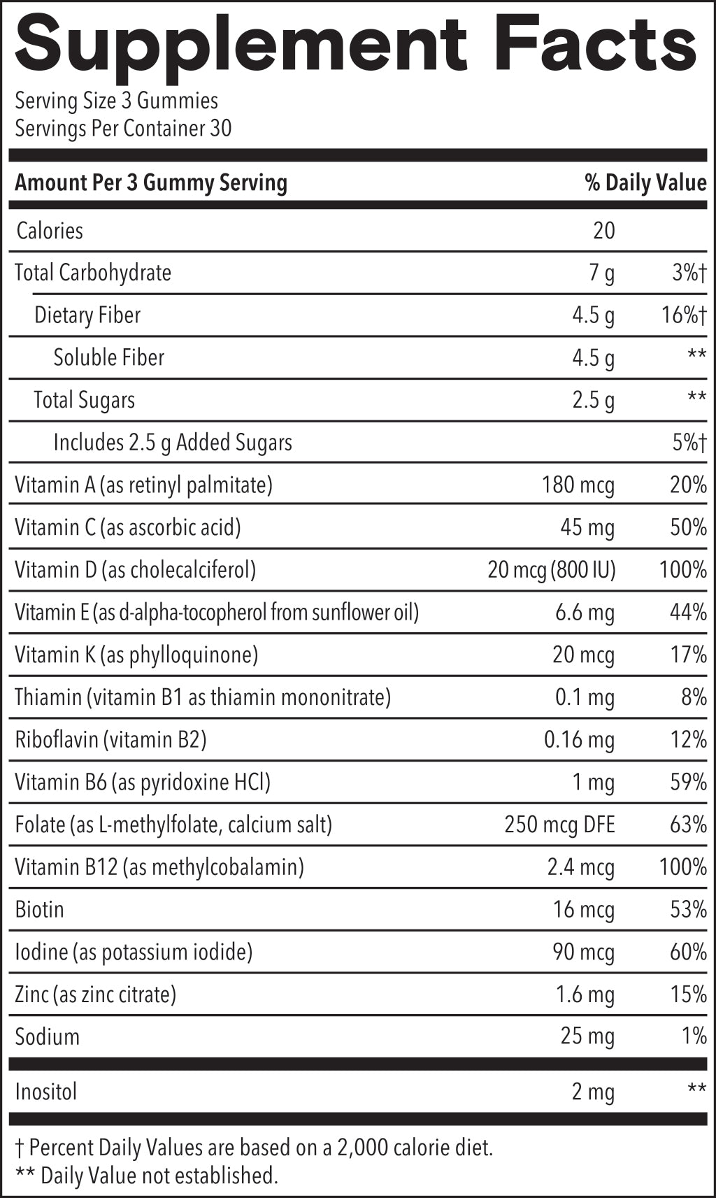Multivitamin to support growing bodies with 15 daily nutrients including vitamins C, D3, B12, A, E, K1, and folate, as well as prebiotic fiber for kids digestive health.*
